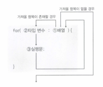 - 블록 내부의 실행문이 모두 실행되면 다시 루프를 돌아 배열에서 가져올 다음 값이 존재하는지 평가