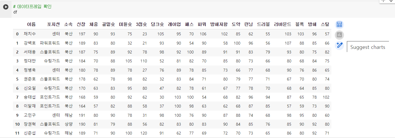 Python Pandas ๋ชจ๋์ ์ฌ์ฉํ๊ณ ๋ฐ์ดํฐ๋ฅผ loadํ์ฌ df๋ผ๋ variable name์ผ๋ก ์ง์ ํ ๊ฒ์ด๋ค. ์์์ ๋งํ๋ฏ์ด ๋ง์ง๋ง return ๊ฐ์ด ํ๋ฉด์ผ๋ก ์ถ๋ ฅ๋๋ฏ๋ก df๋ผ๋ dataframe์ด ์ถ๋ ฅ๋๊ณ ์๋ค. ๊ฑฐ๊ธฐ์ "Suggest charts" ๋ผ๋ Option์ด ์กด์ฌํ๋๋ฐ, Google colab์์ ์ถ์ฒํด์ฃผ๋ ๊ฐ์ข ์๊ฐํ๋ ์ฐจํธ๋ค์ ๋ณด์ฌ์ค๋ค.