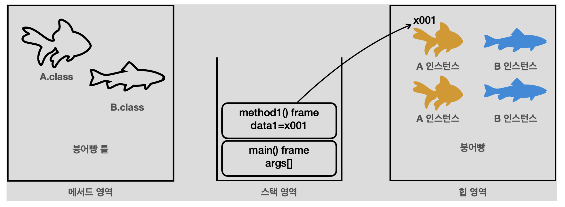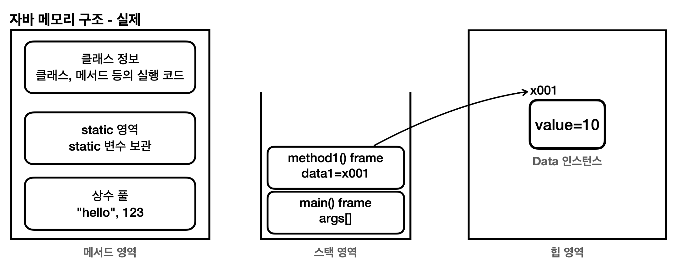 Java의 메모리 구조는 다음과 같은 3가지 영역을 가진다. 클래스 정보를 보관하는 메서드 영역, 실제 프로그램이 실행되는 스택 영역,