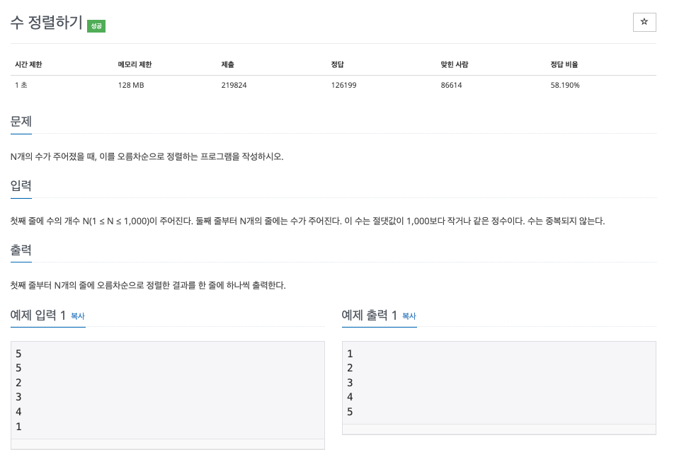 N개의 수가 주어졌을 때, 오름차순으로 정렬하는 문제이다. (단, 수는 중복 X)
