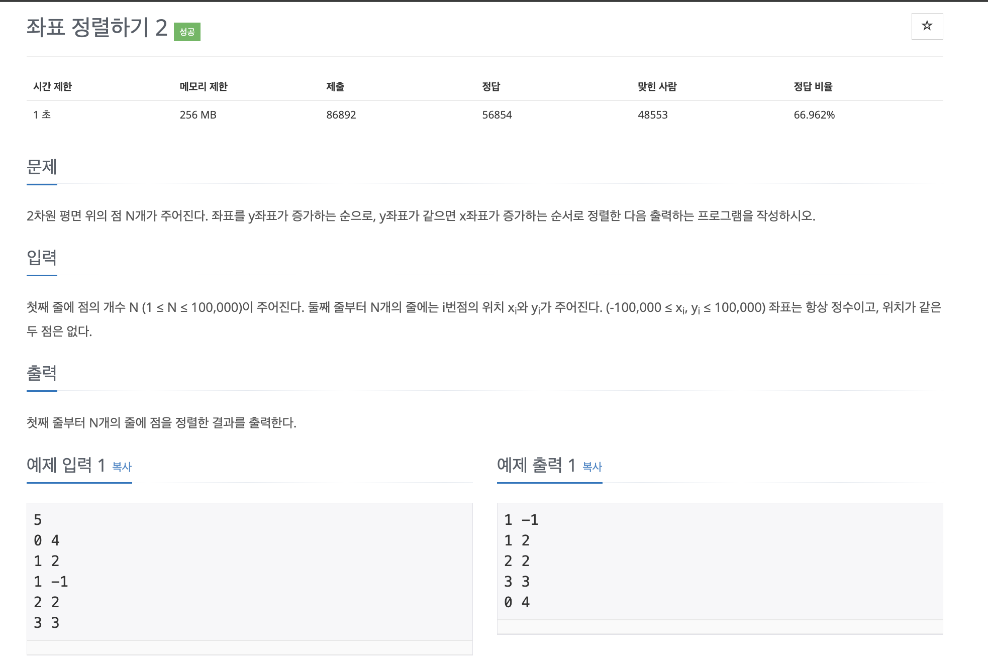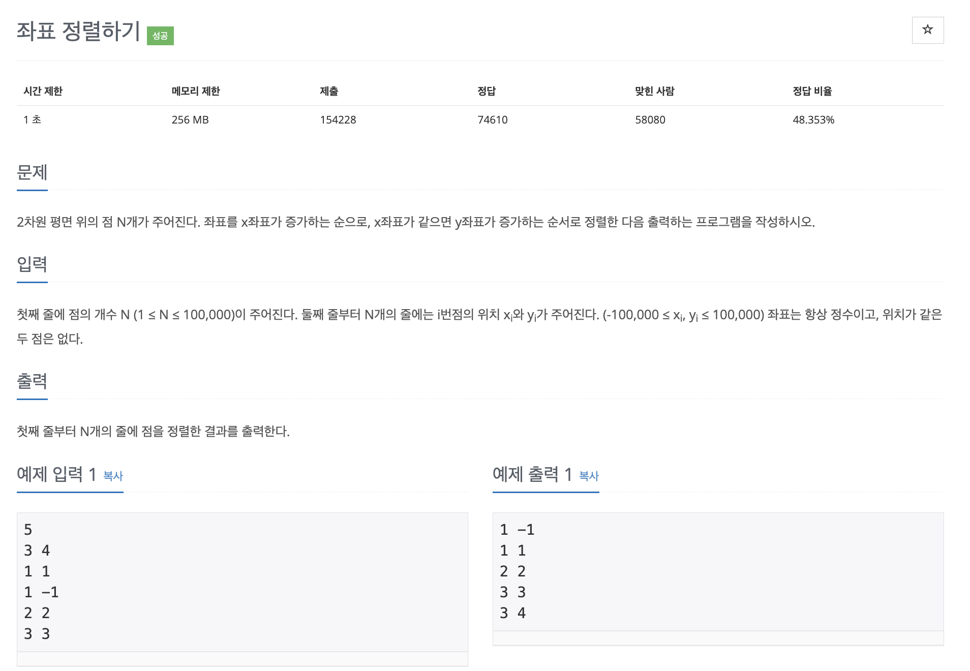 y를 기준으로 하는데, 같으면 x를 기준으로 진행하는 좌표 정렬하기 문제이다.