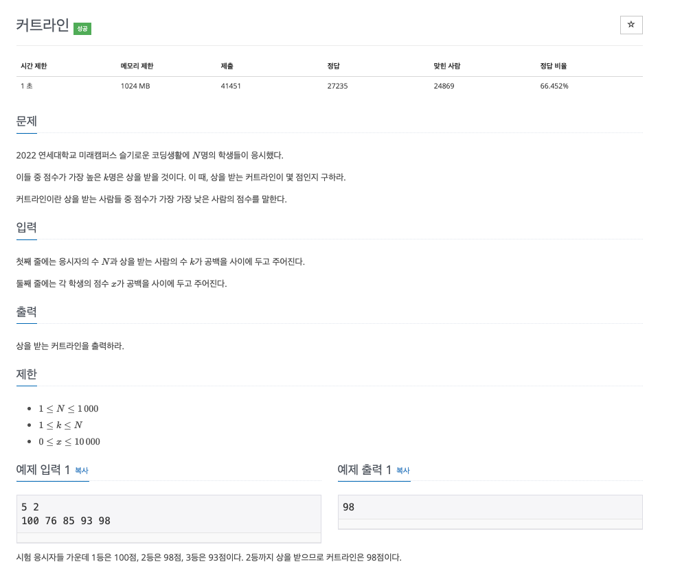 N명 중 k명까지만 상을 받고, 커트라인의 점수를 출력하는 문제이다.