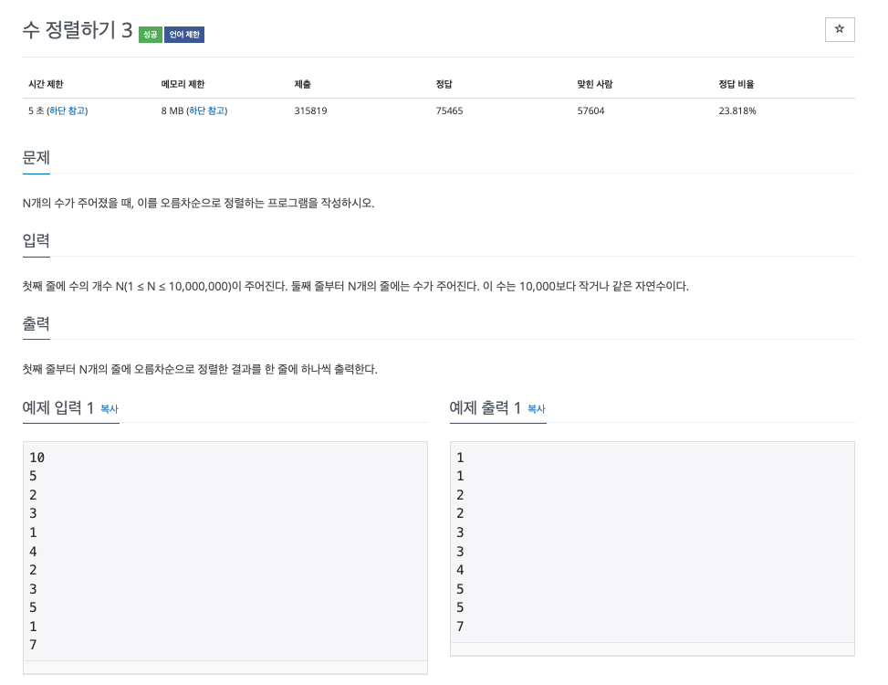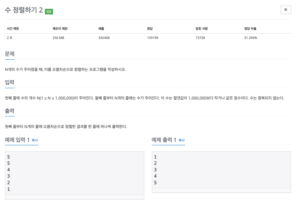 수 정렬하기 2와 같은 문제이지만, 더욱 빠르게 효율을 낼 수 있도록 하는 문제이다.