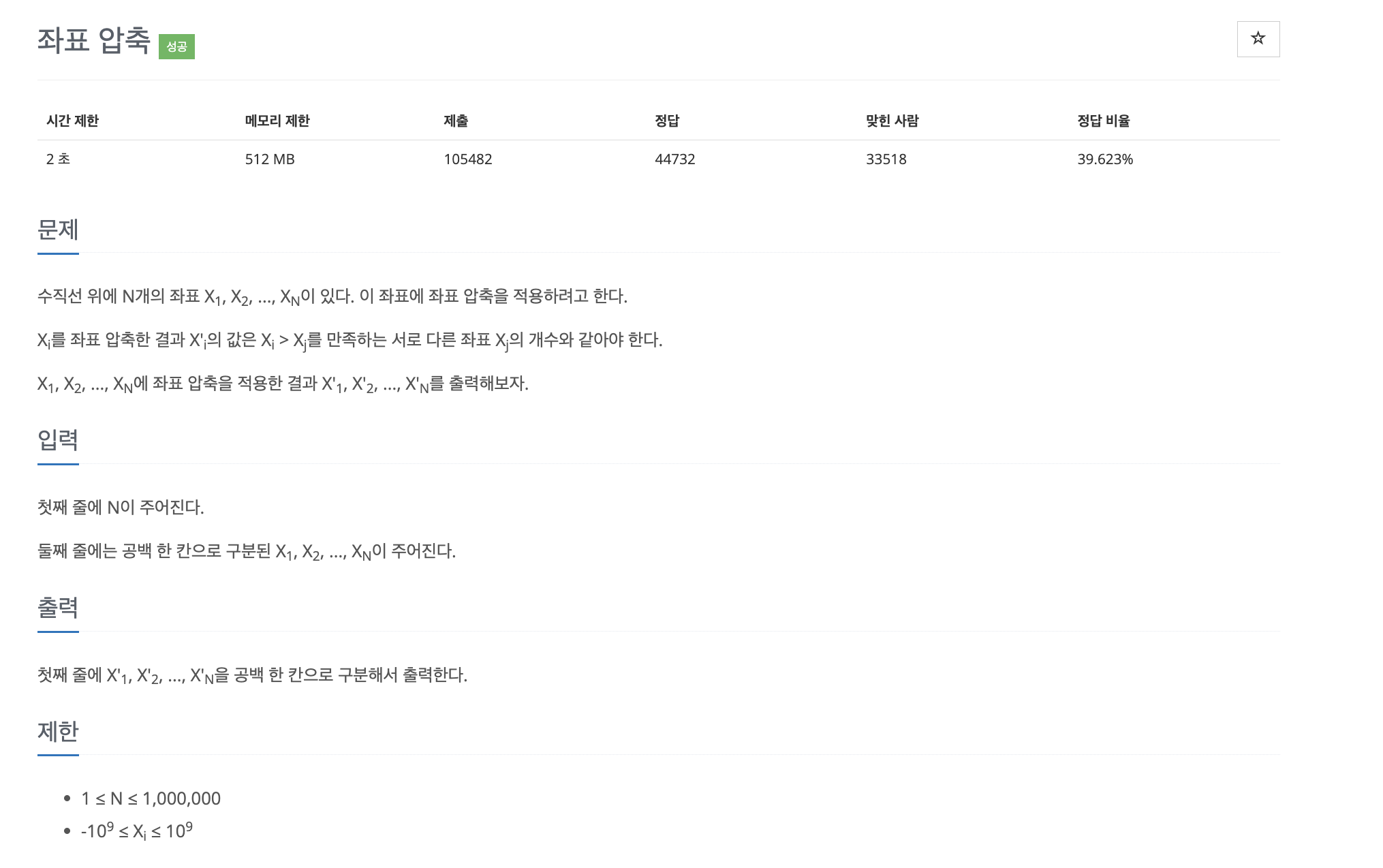 ex ) [1, 10, 10000, 1000000] -> 좌표를 압축하고 순서대로 표현하면 [0, 1, 2, 3],,