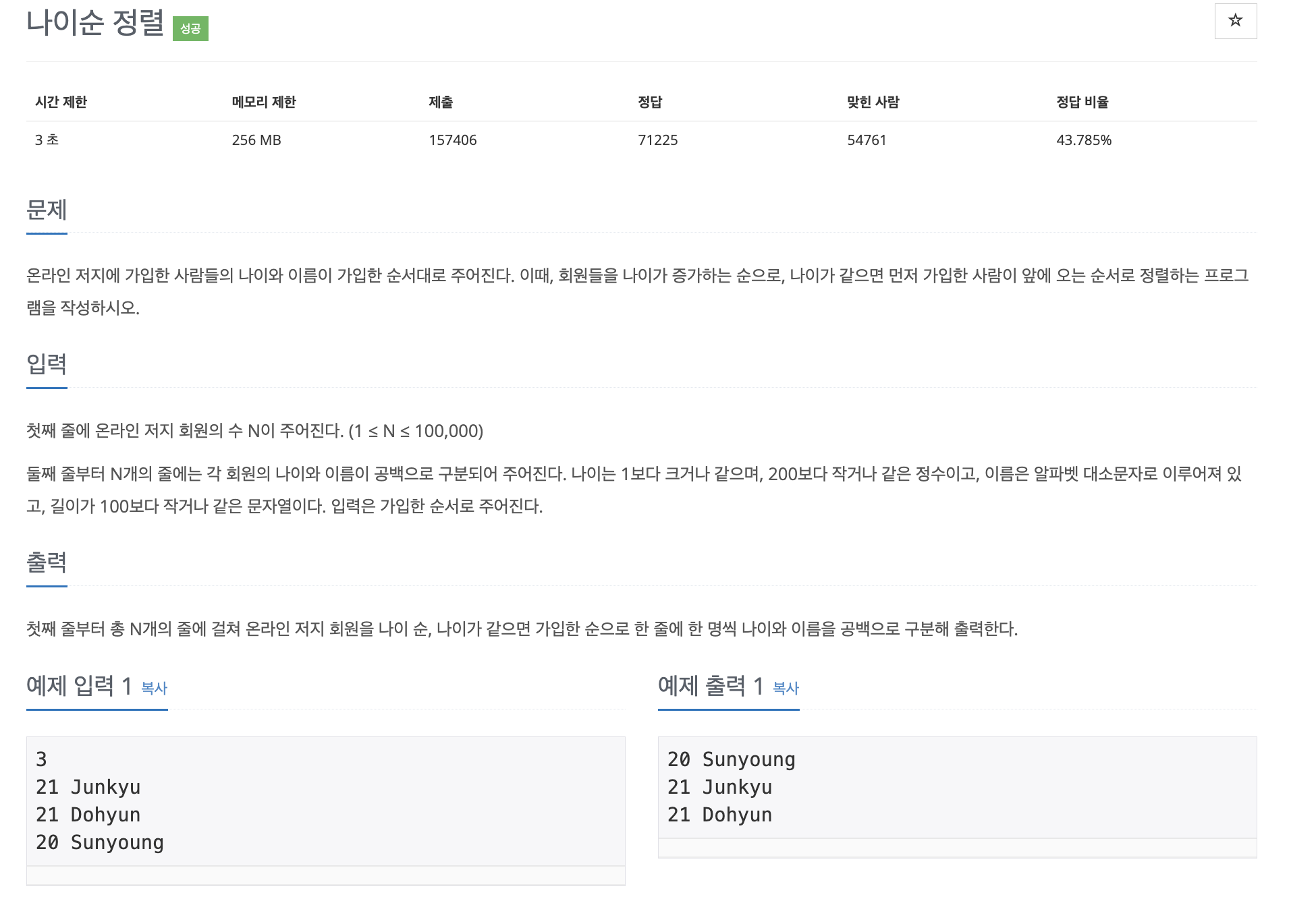 회원의 나이 이름을 입력으로 넣는데, 결국 나이가 증가하는 순, 같으면 먼저 가입한 순으로 출력한다.