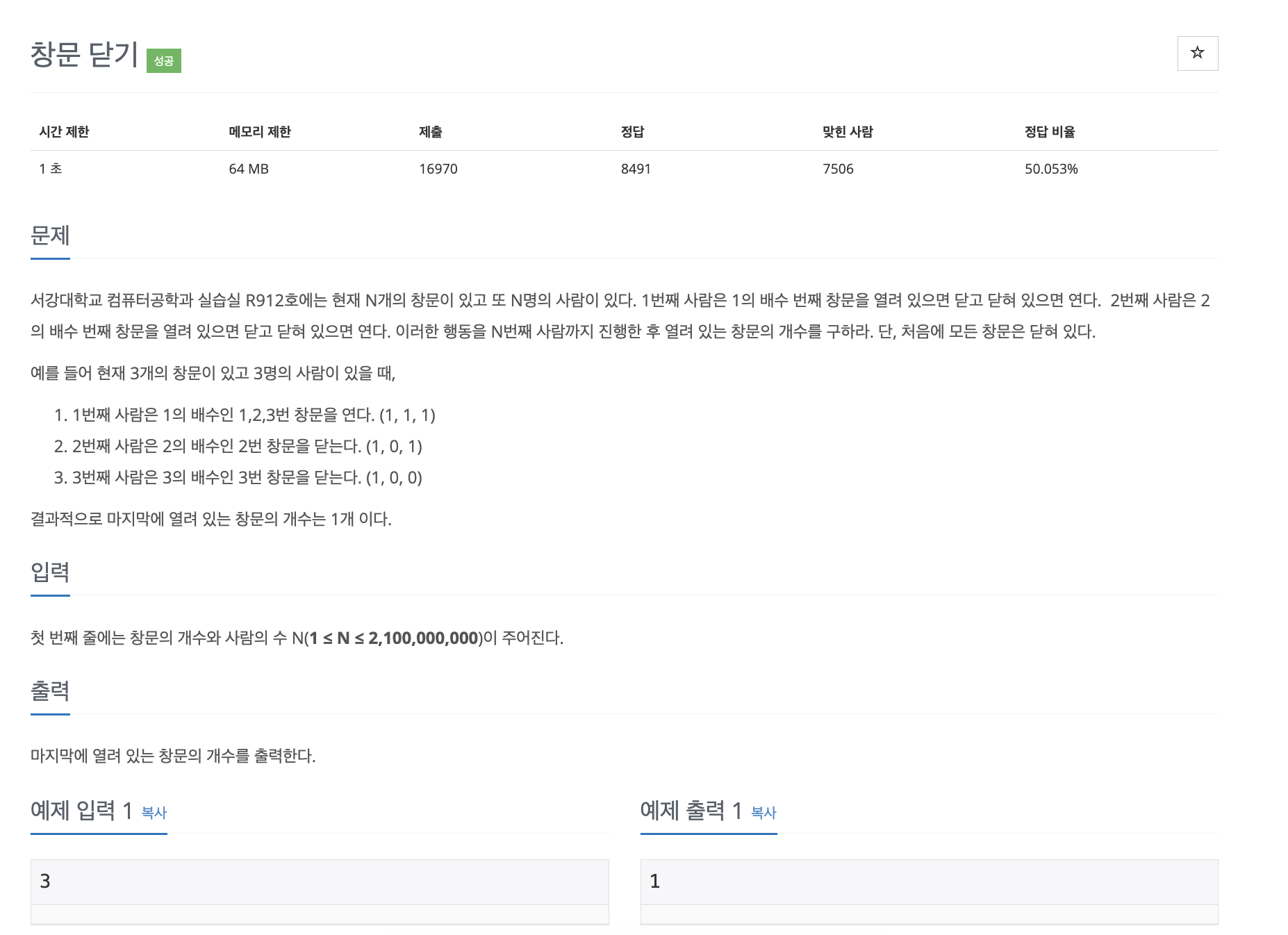 즉, 제곱수의 창문만이 홀수 번 열고 닫히므로, 마지막에 열려있게 된다.