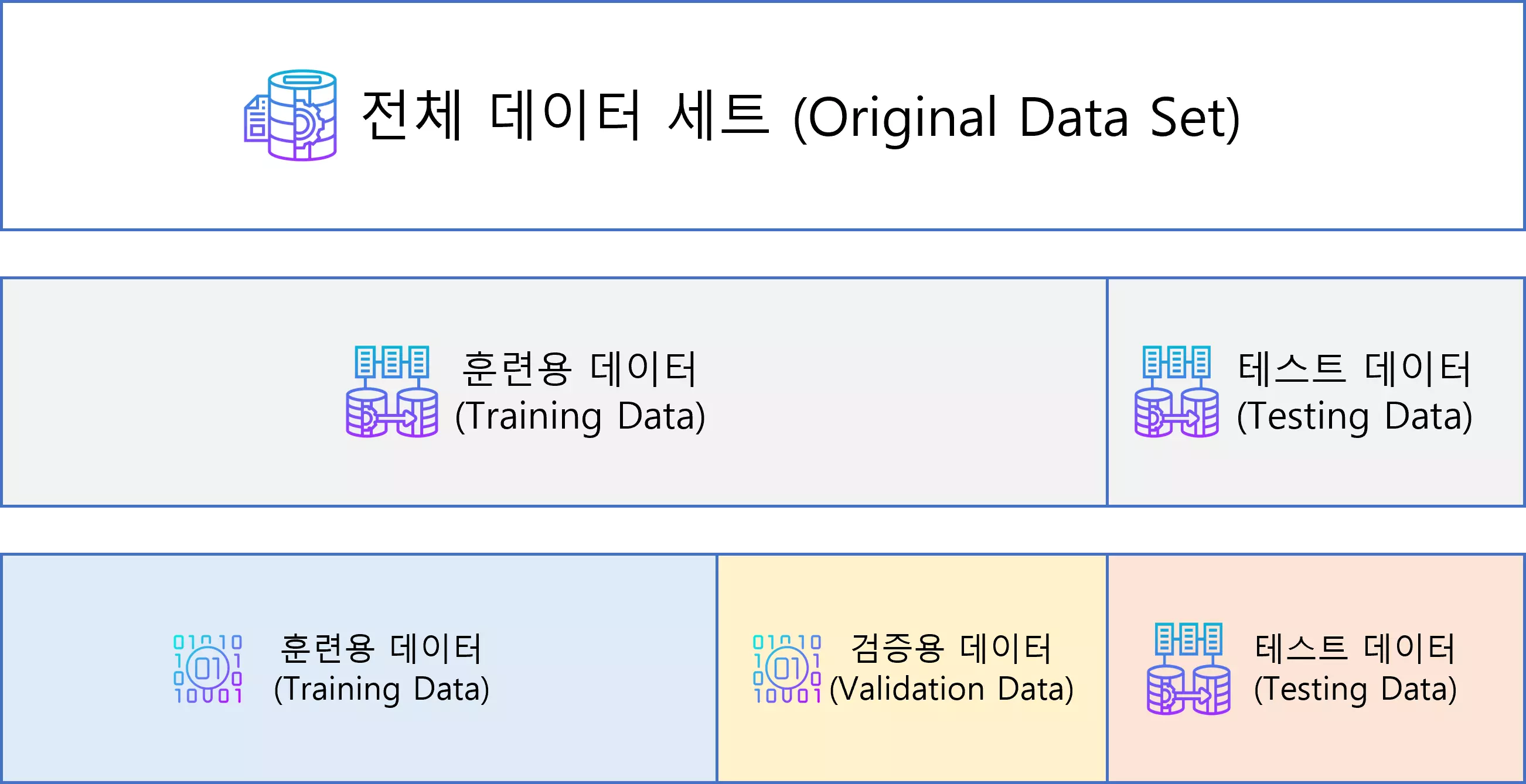 일반적으로 모델의 성능을 검증하기 위해 데이터를 학습, 검증, 평가 세 부분으로 나누어 실험을 설계