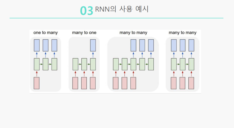 - Delayed Many to Many : Machine Translation (입력된 언어를 다른 언어로 변환하는 기계 번역)