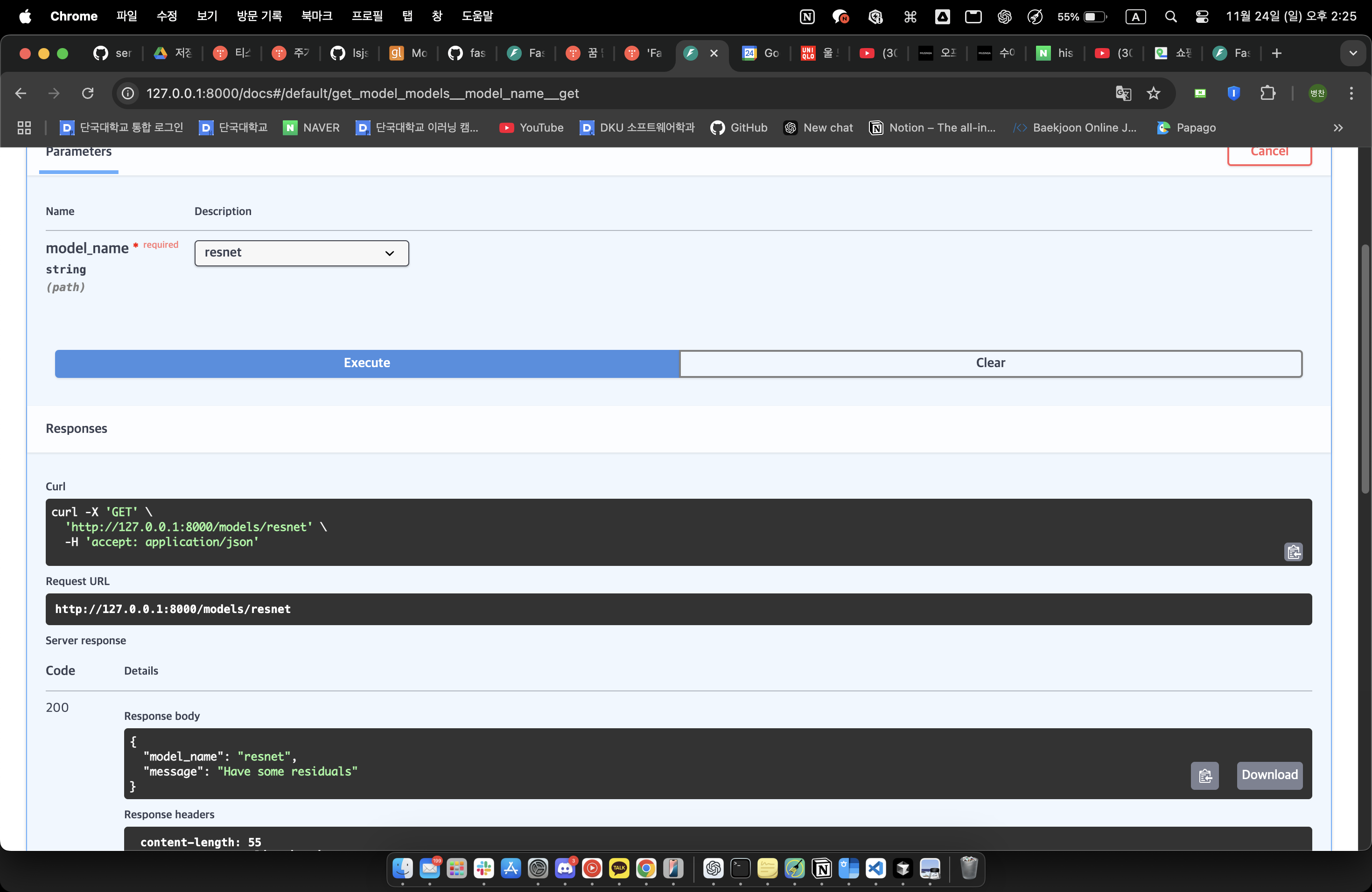 get 으로 /models/{model_name} 을 받았을 때 model_name에 따라 return 값이 다르게 나오도록 하는 코드이다.