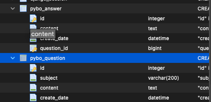 - 실제 테이블은 위 사진처럼 생성되었지만 실제 코딩할 때는 알 필요 없는데, "Question", "Answer" 같은 Model 을 사용하기 때문임.