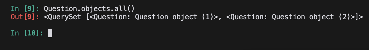 - "Question.objects.all()" 결과값으로 QuerySet 객체를 반환하며, 그 안에는 저장된 Question 객체들이 포함되어 있음.