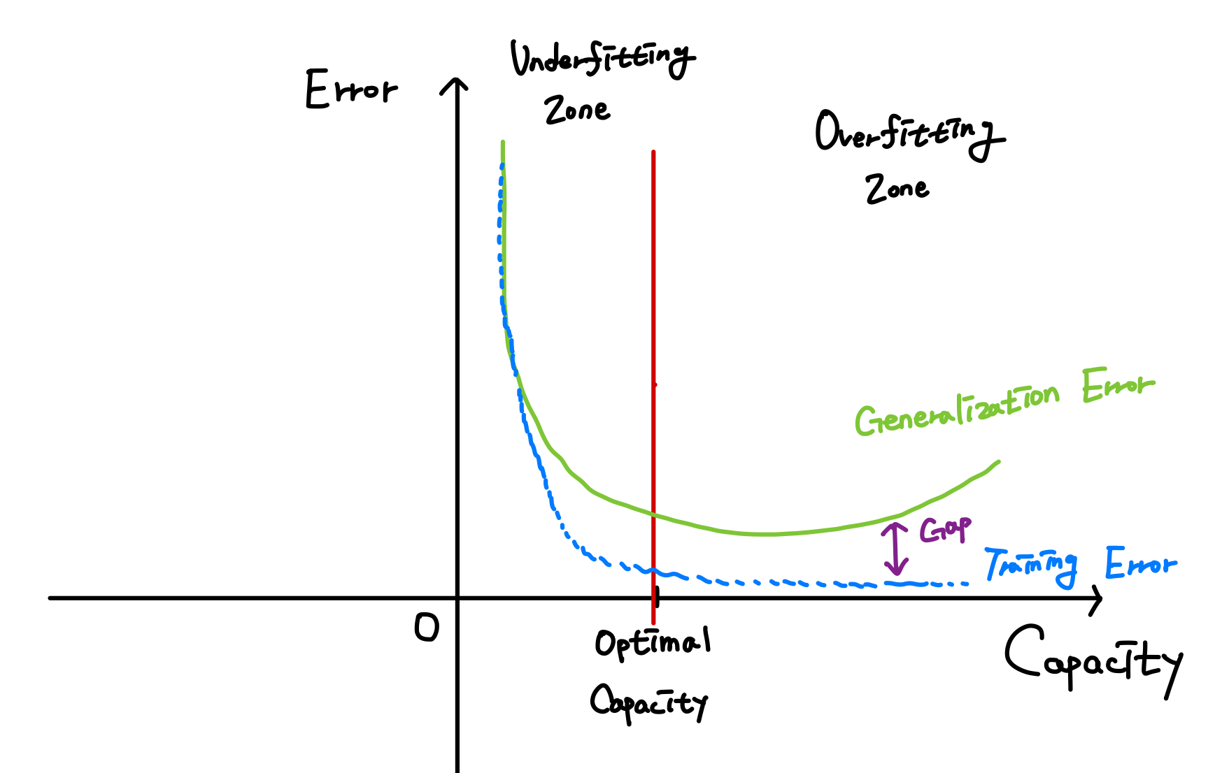 Capacity 를 늘릴 경우, Training error 는 감소하지만 Training error 와 Generalization error 와의 gap 은 더욱 커진다.