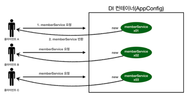 - 만든 Spring 이 없는 순수한 DI 컨테이너인 AppConfig 는 요청을 할 때마다 객체를 바로 생성한다.